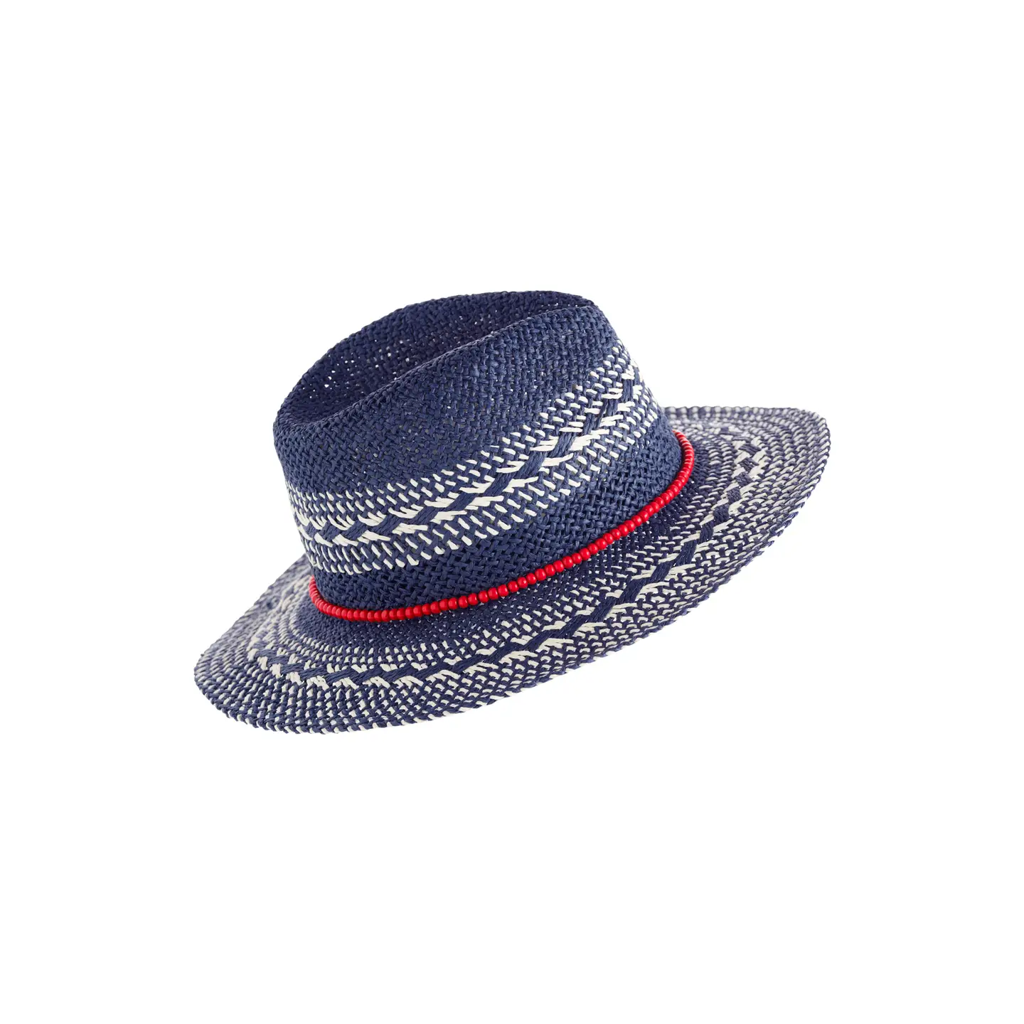 Keep the sunshine out of your eyes this summer with the Ames Hat. Made from deep blue paper straw with white woven details, this chic beach hat is the perfect match to any summer outfit.