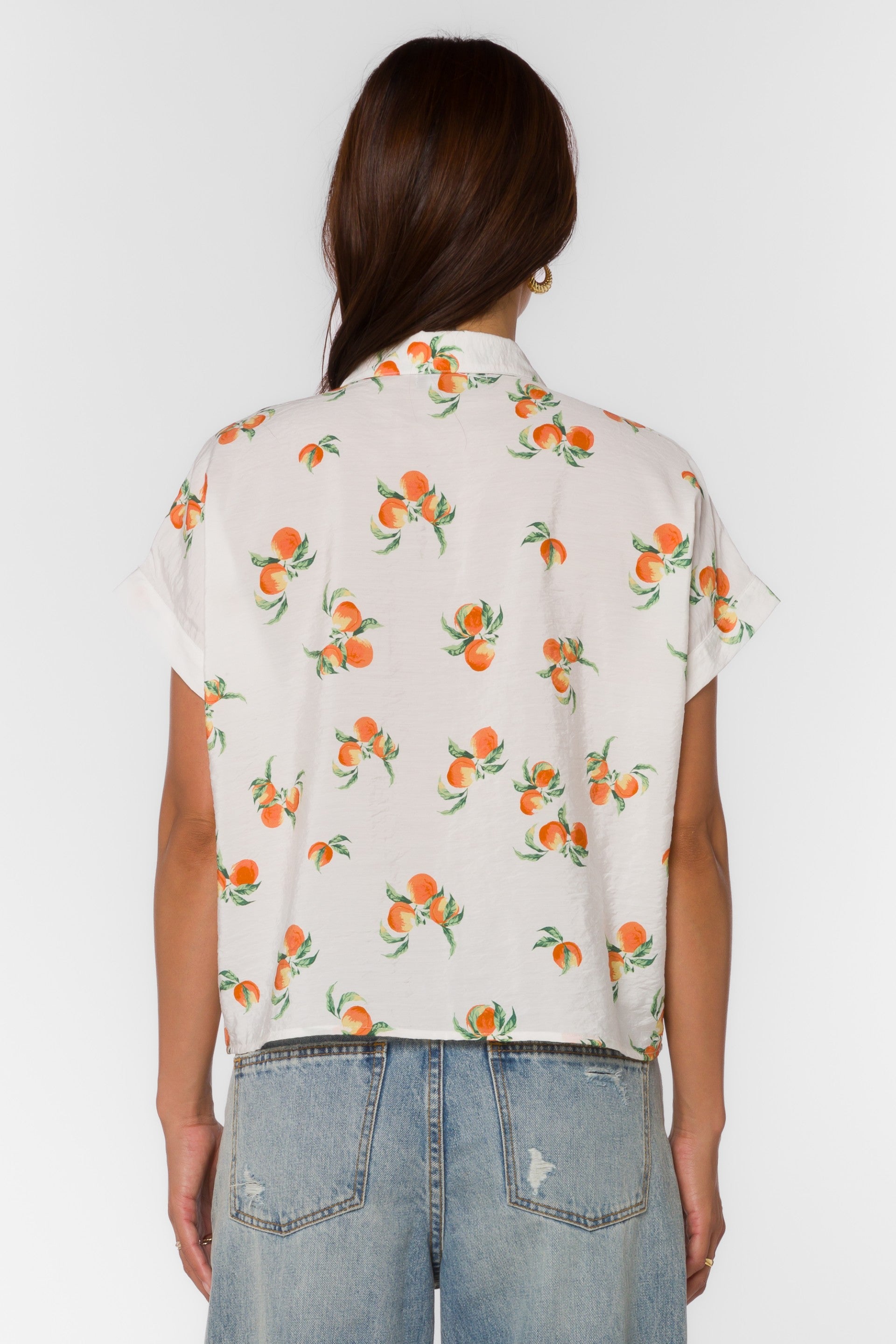 Unleash your bold style with the Bane Shirt. This boxy button-up features a lapel collar, short cuffed sleeves, and a single chest pocket. Fruit is super on trend this season, and the peaches are so sweet. Pair with the matching Morella pants, or with denim, for a cute look.