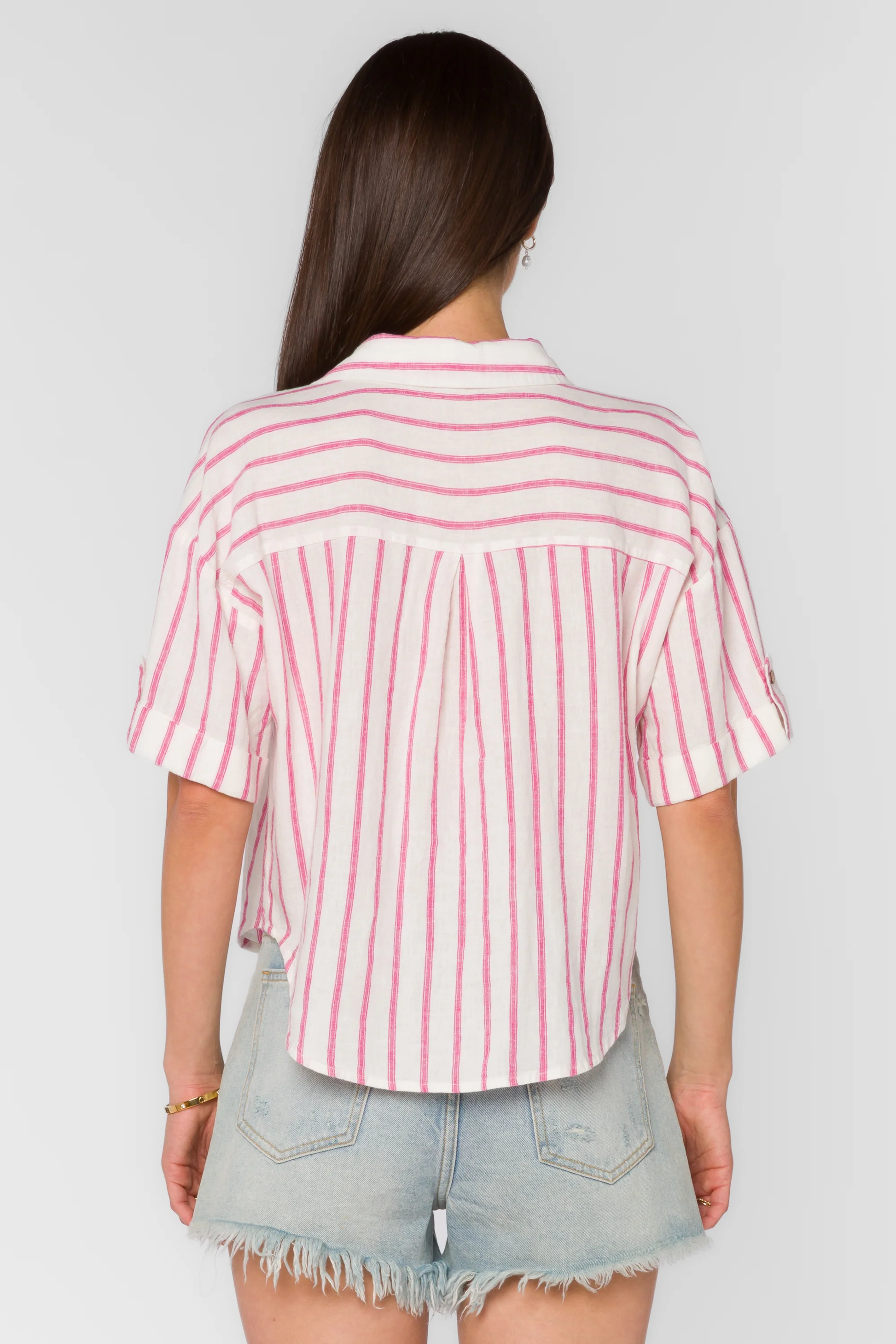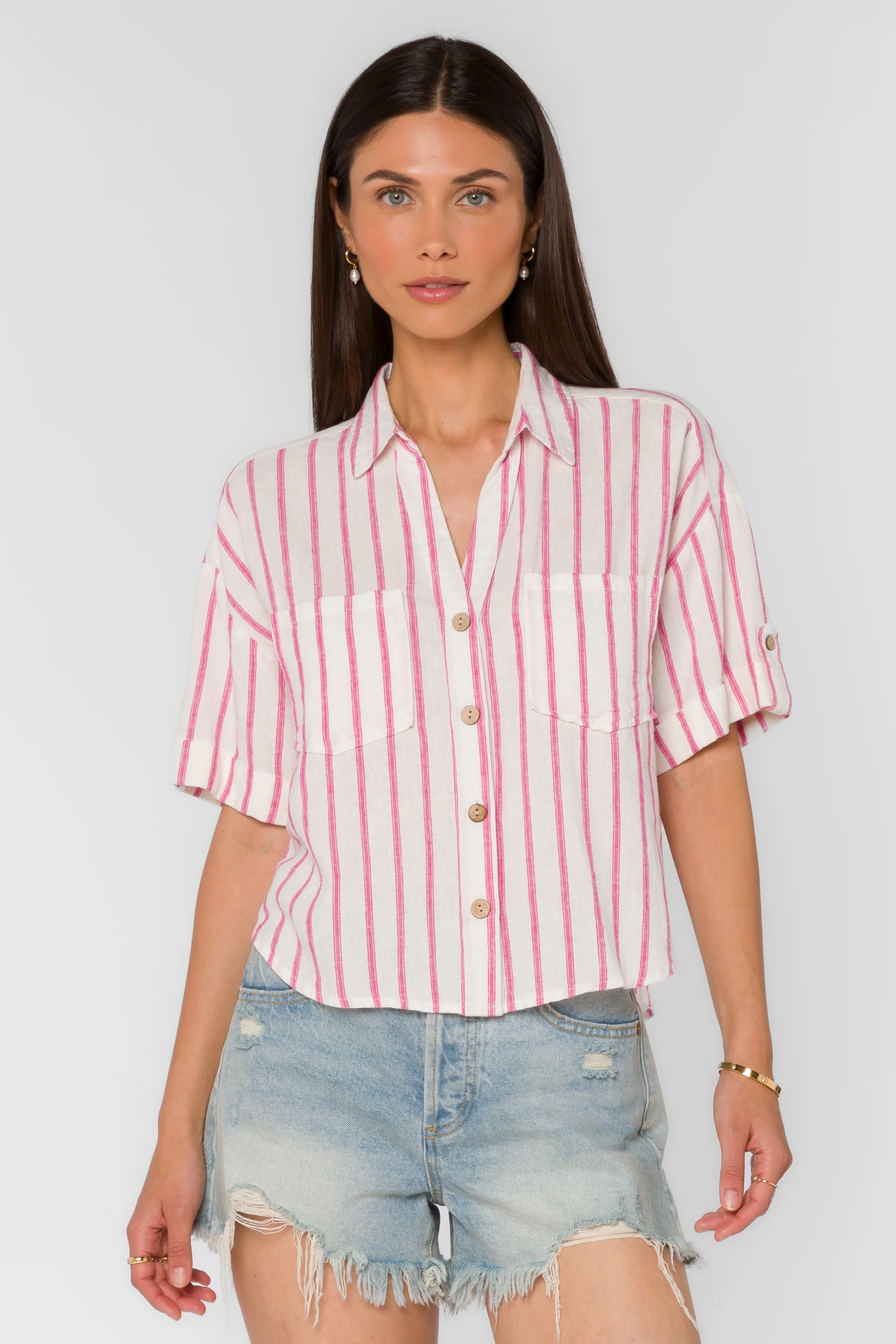 Expertly crafted with a chic fuchsia stripe design, this Brandon shirt features a unique short tab sleeve and drop shoulder style. Complete with a button front closure and convenient chest patch pockets, this shirt offers both style and practicality. Perfect for any occasion.