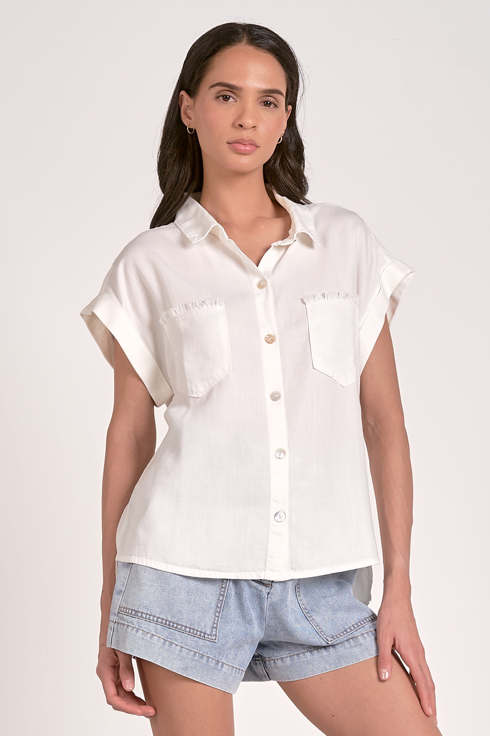 A classic short sleeve button down with a beautiful twist. The pockets have a fringe top and the buttons are a beautiful mother of pearl.