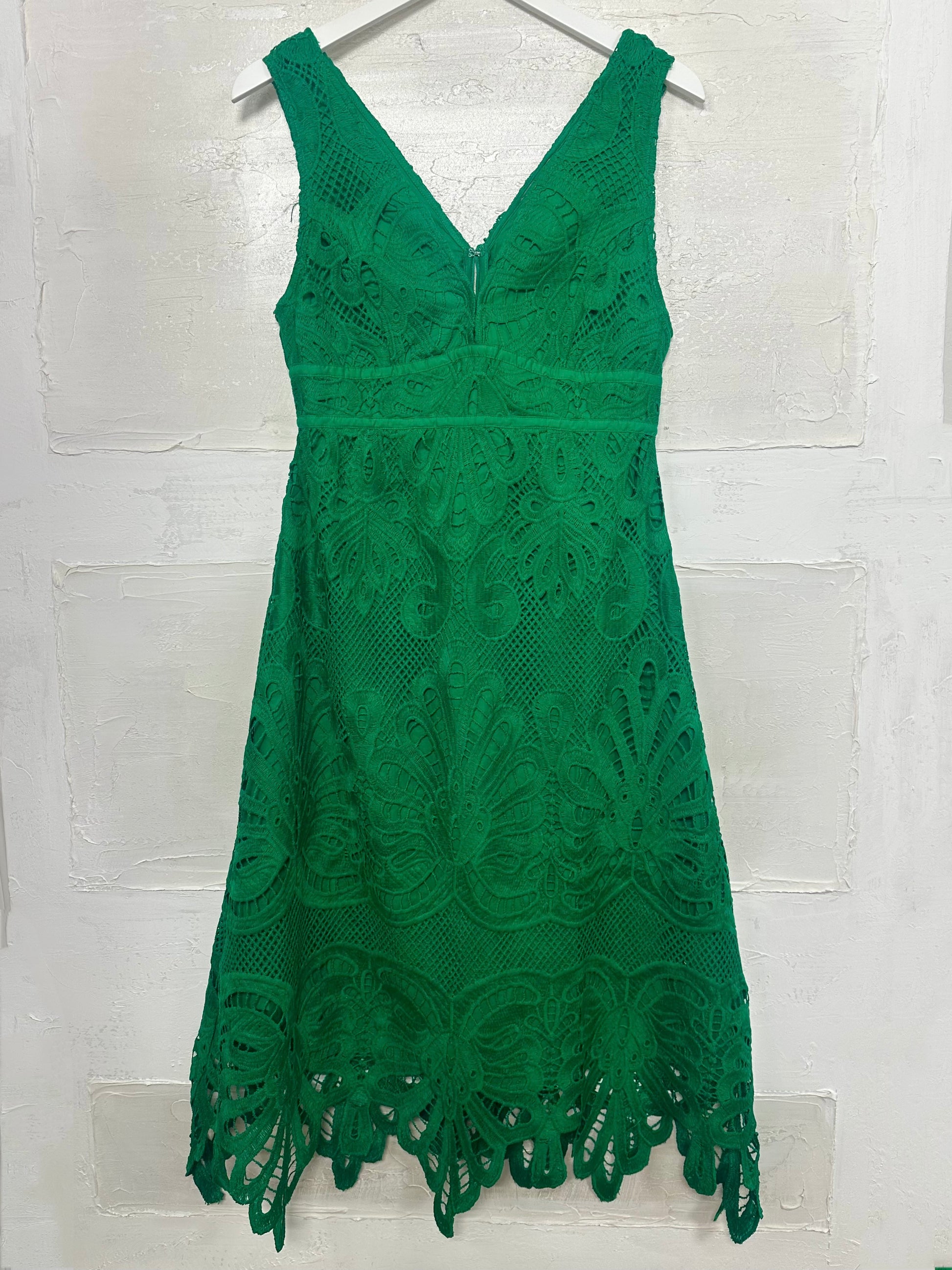 A stunner! This dress comes in both kelly green and white. An all over lace pattern, fully lined with a gorgeous v neck detail. Hits mid calf so it is perfect with heels or flats.