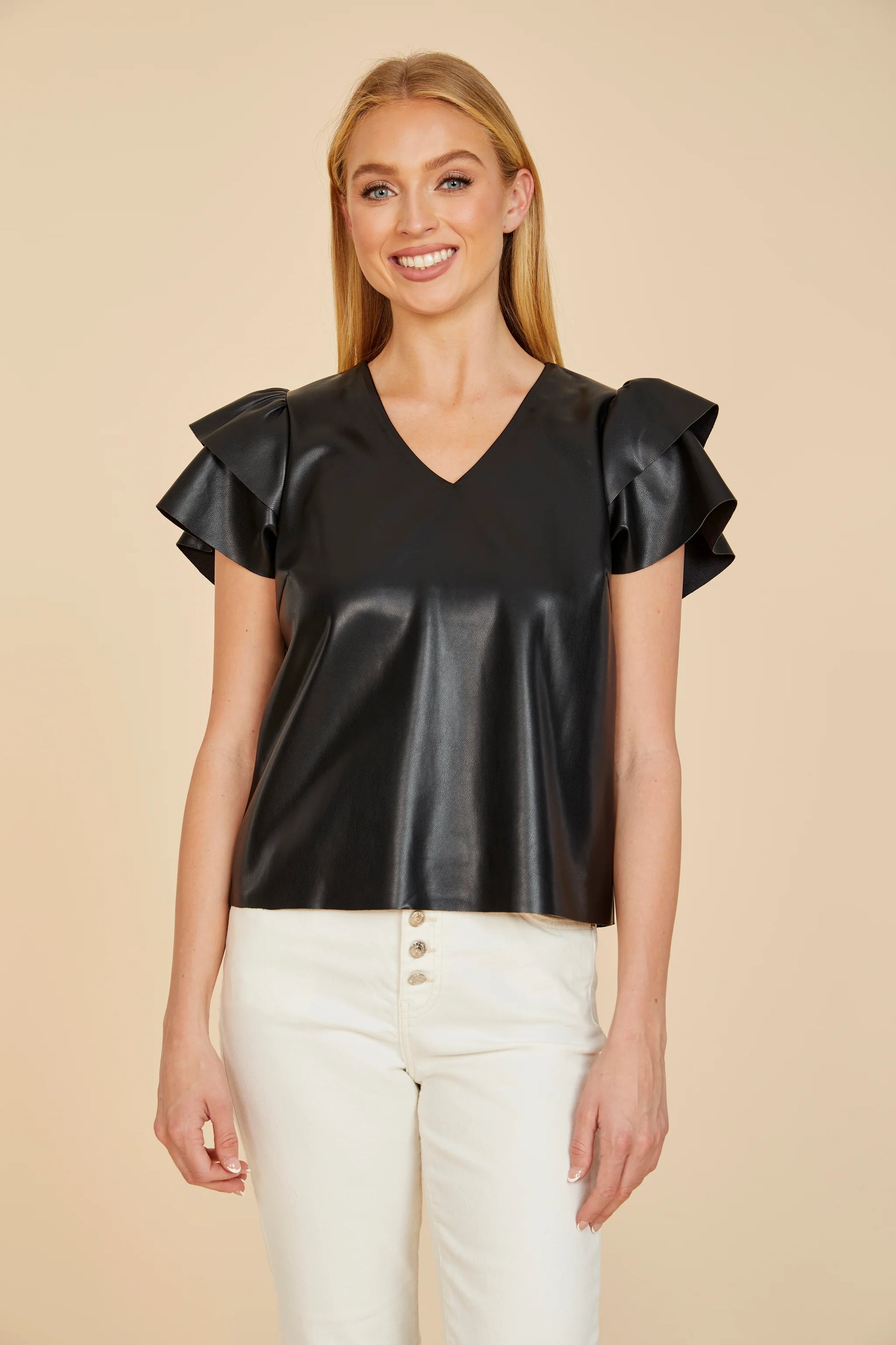 Revitalize your wardrobe with our Vegan Leather Flutter Sleeve Blouse. Crafted from faux leather, this blouse brings an edgy twist to your look. The fun and playful flutter sleeves add a touch of whimsy, creating a dynamic and stylish ensemble. This blouse is perfect for adding a pop of excitement to your outfits. Embrace a daring and contemporary aesthetic with this unique faux leather piece.