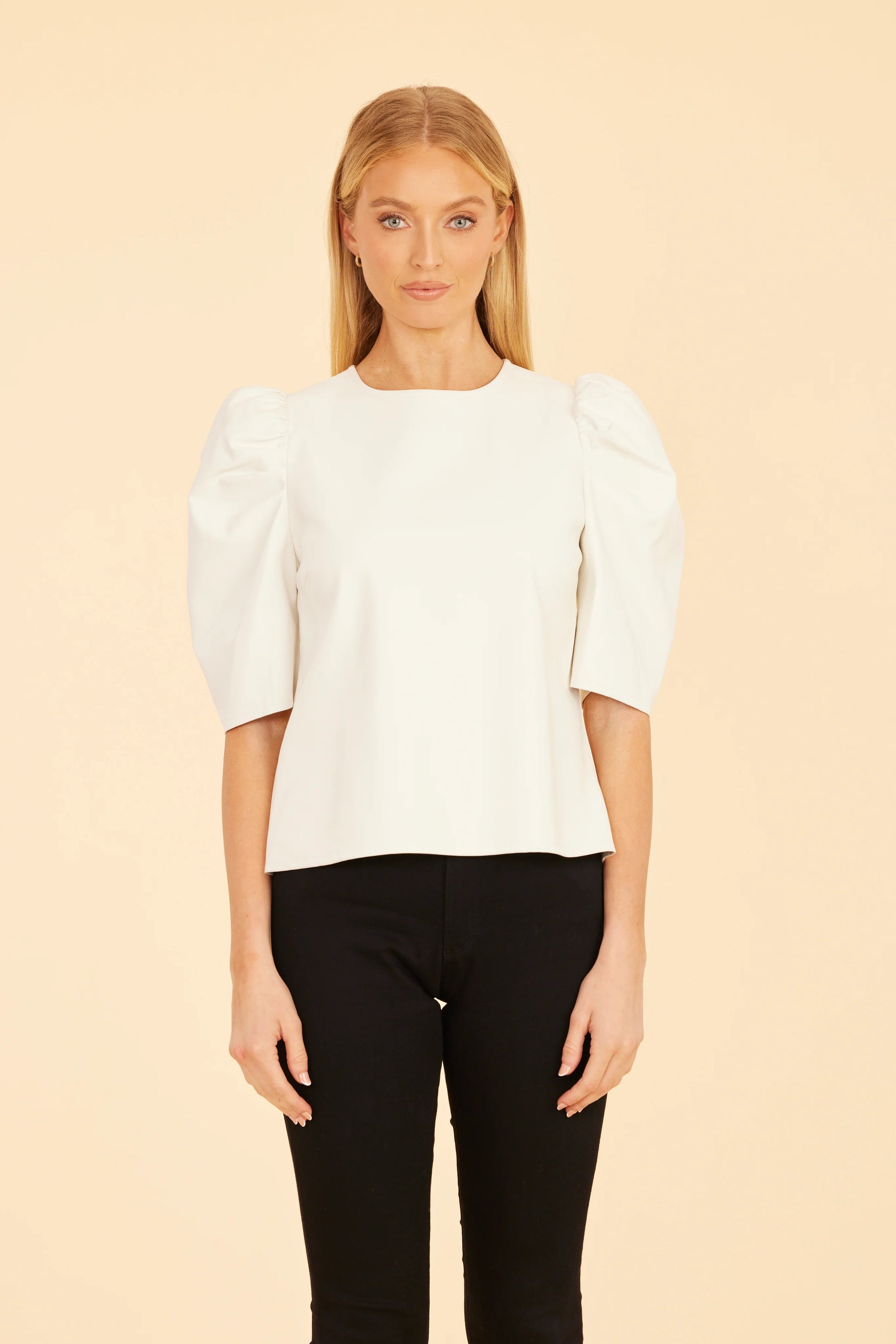 Add a spark to your closet with our Vegan Leather Puff Shoulder Blouse. Crafted from faux leather, this blouse brings an edgy twist to your look. The puff sleeves add a touch of whimsy, creating a dynamic and stylish ensemble. This blouse is perfect for adding a pop of excitement to your outfits. Embrace a daring and contemporary aesthetic with this unique faux leather piece.