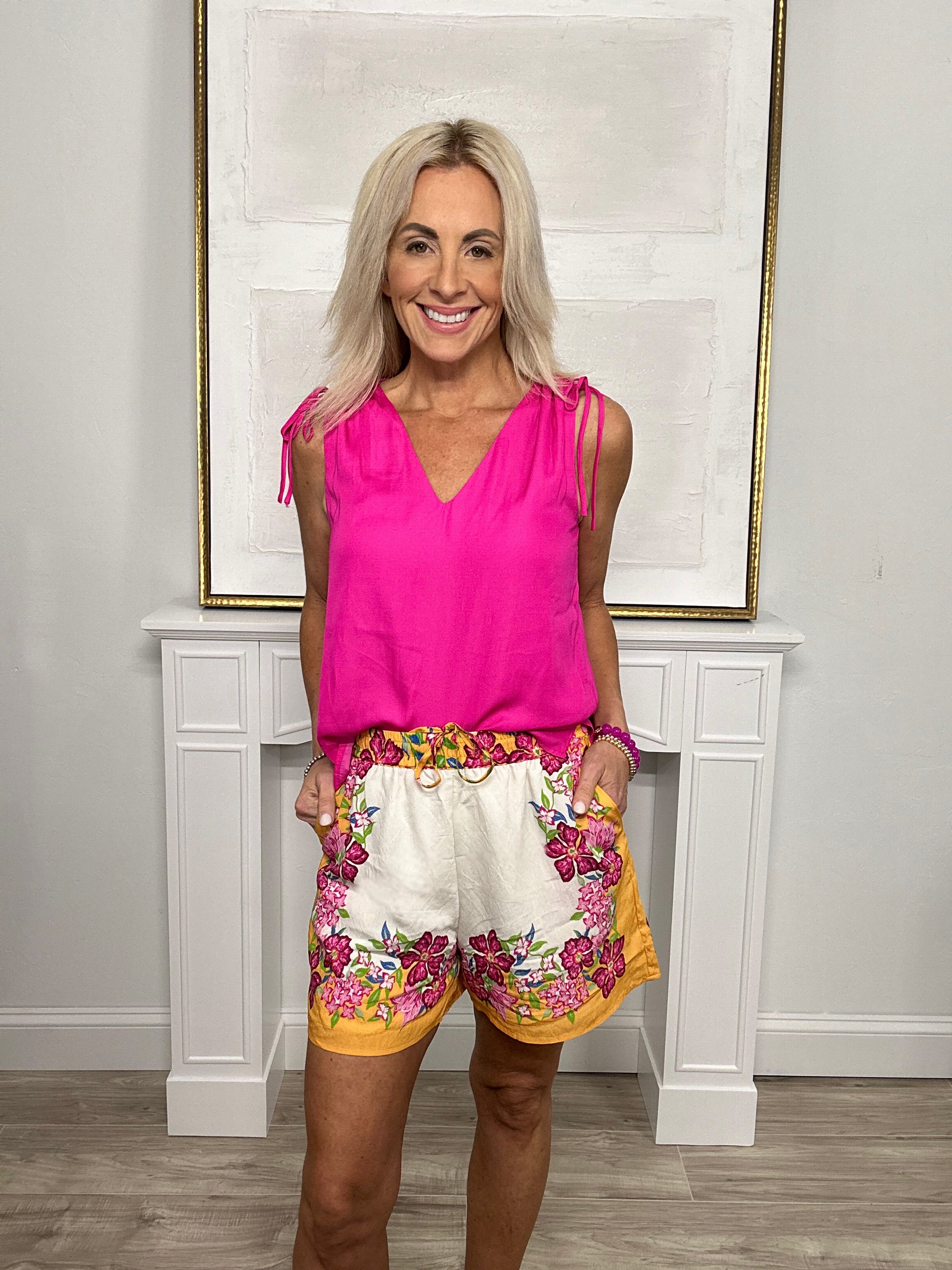 We can't get enough of these floral shorts. A drawstring waist and they have pockets. These shorts are super comfortable, and can easily be dressed up or down. There is a matching top, and we also love with a solid tank or graphic tee. So many options!