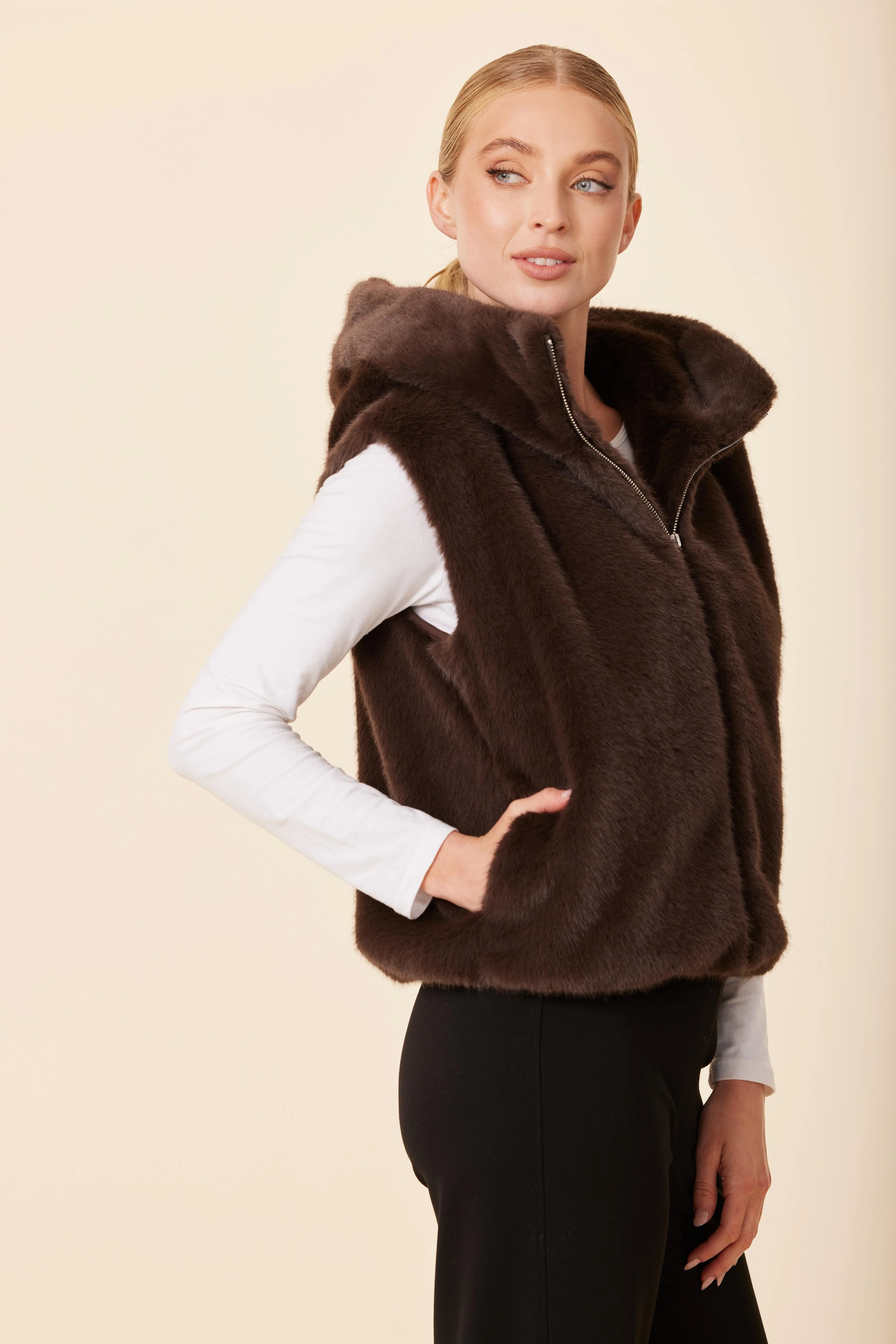 Stay stylish and cozy in our faux fur zip hoody vest, a chic layering essential for Fall. Featuring a soft plush texture, zip-front closure, and side pockets, this vegan fur vest is perfect for fall layering, casual streetwear, and transitional outerwear. Pair it with long-sleeve tops, sweaters, or tailored pants for effortless seasonal style.