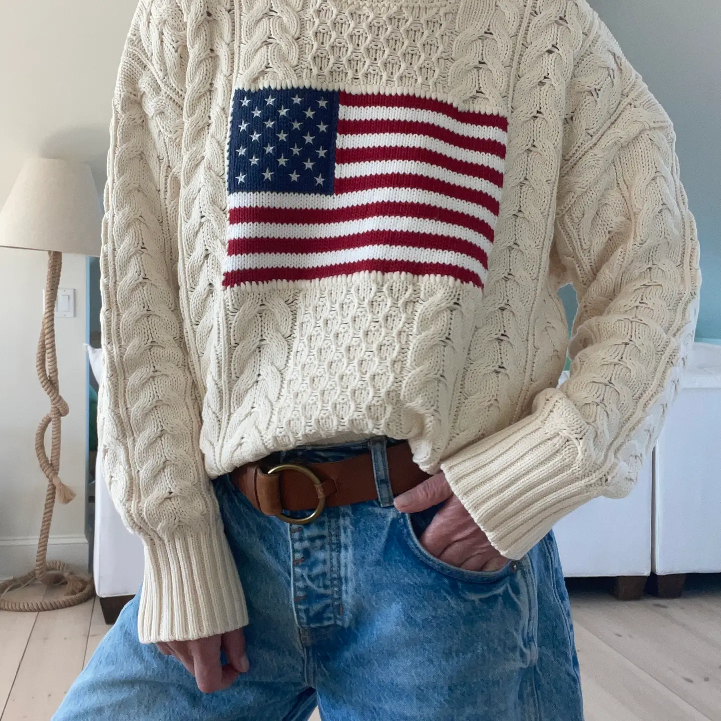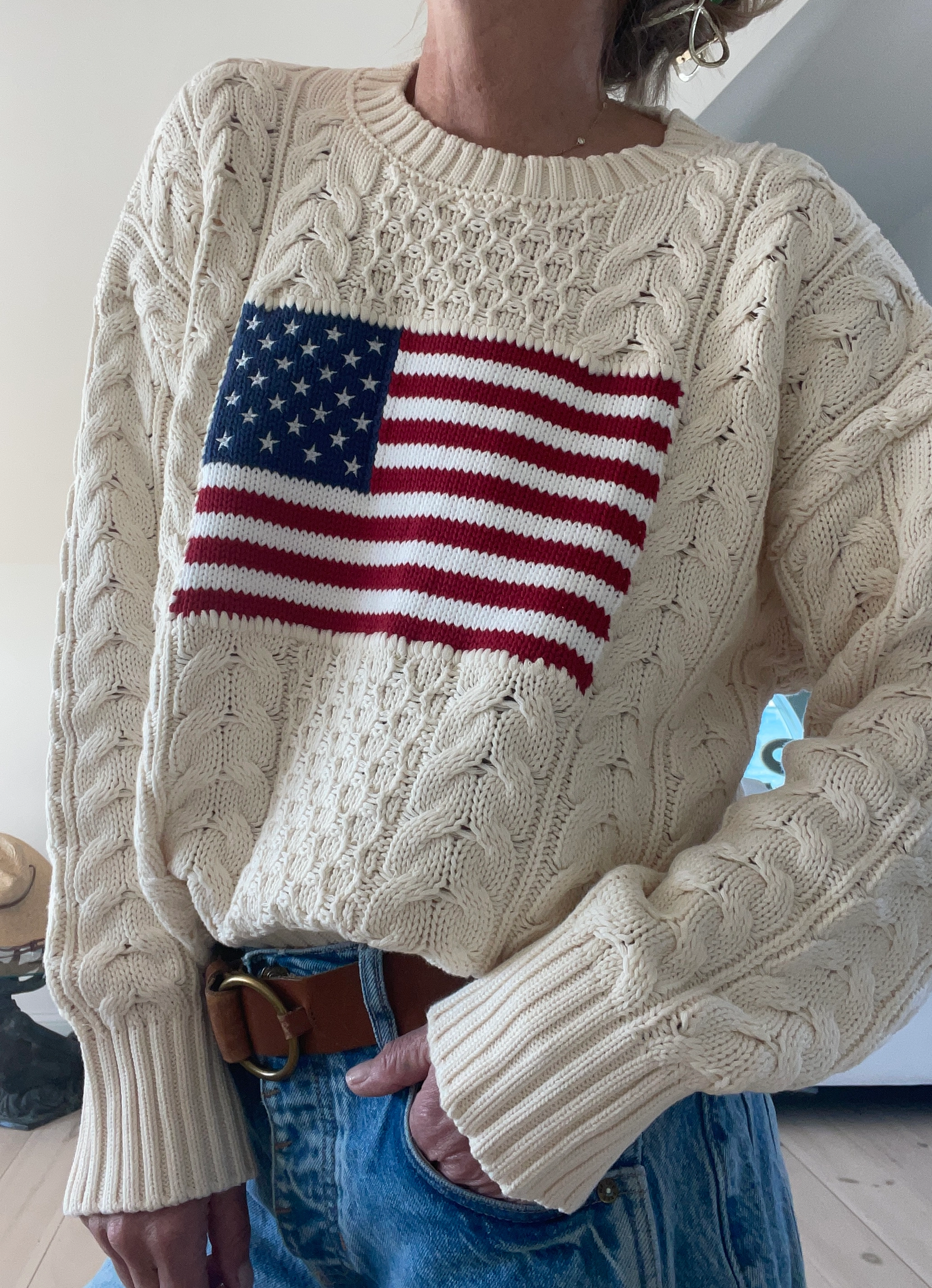 Taking all the best features of our sweaters and twisting them into one magnificent sweater. 100% cabled cotton with a flag knit right in and delicately whip stitched around the edge creating the most loved sweater you will ever own.