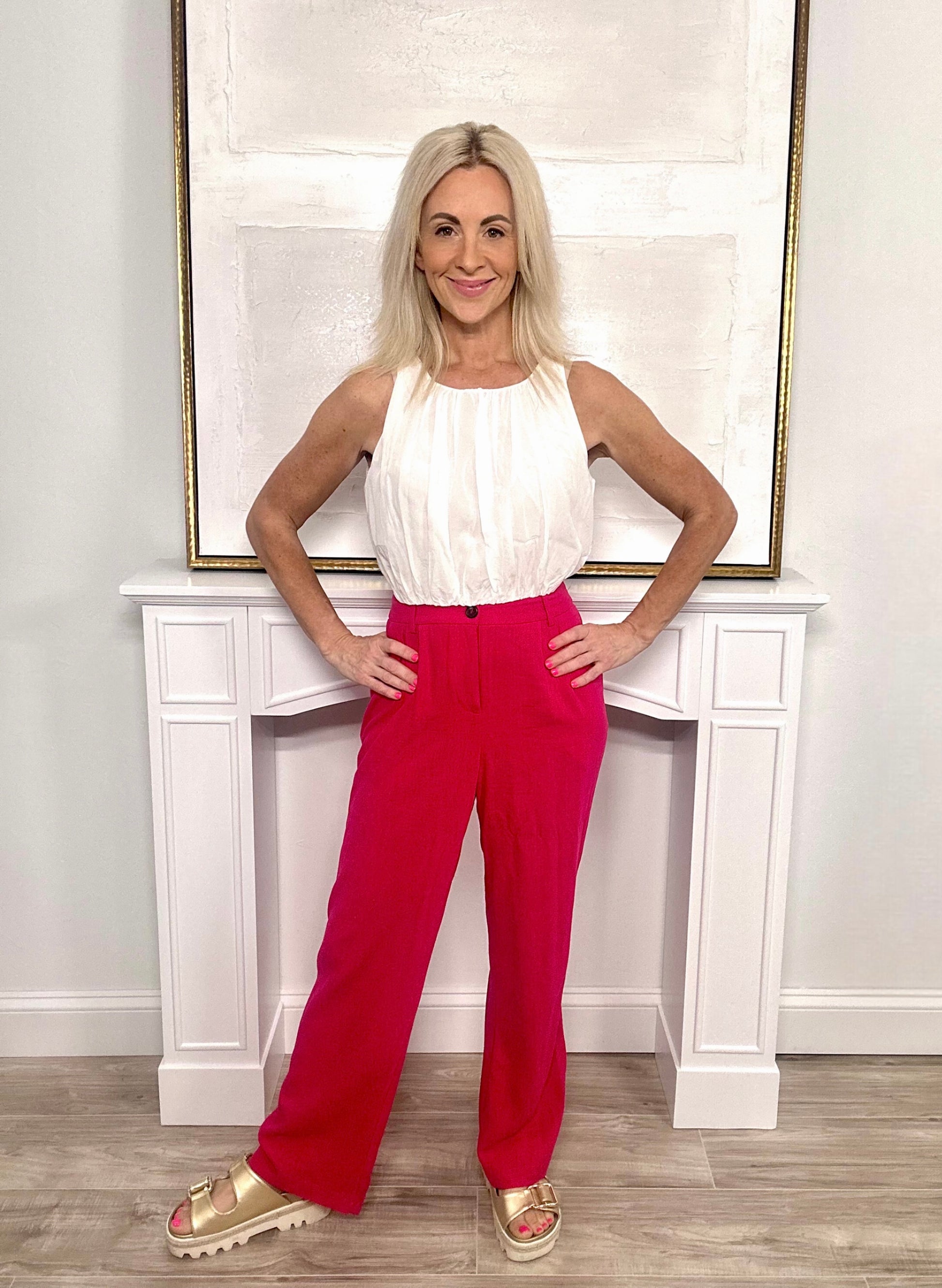 A slightly cropped halter top with elastic bottom is perfect for Summer. Pair with a high waisted pant or skirt for a great look.