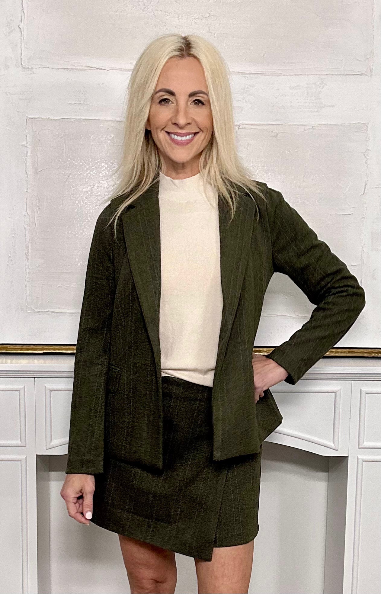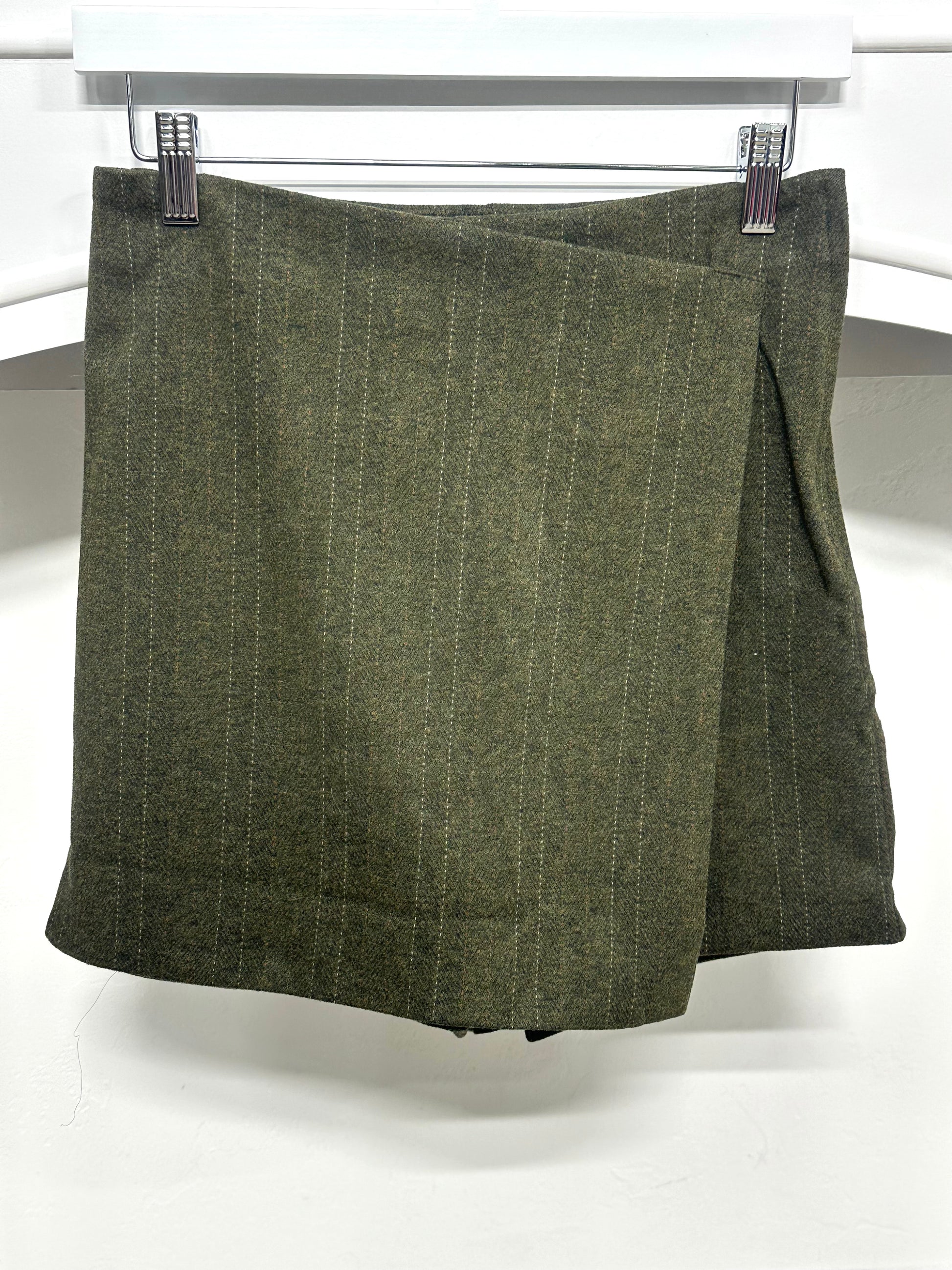 How cute is this skort! A gorgeous olive colored pinstripe in the softest fabric. It feels almost felt like. The cross over skirt in the front hangs at a slight angle giving this traditional style a bit of an edginess and flair. Shorts underneath show in the back. There is a matching blazer.