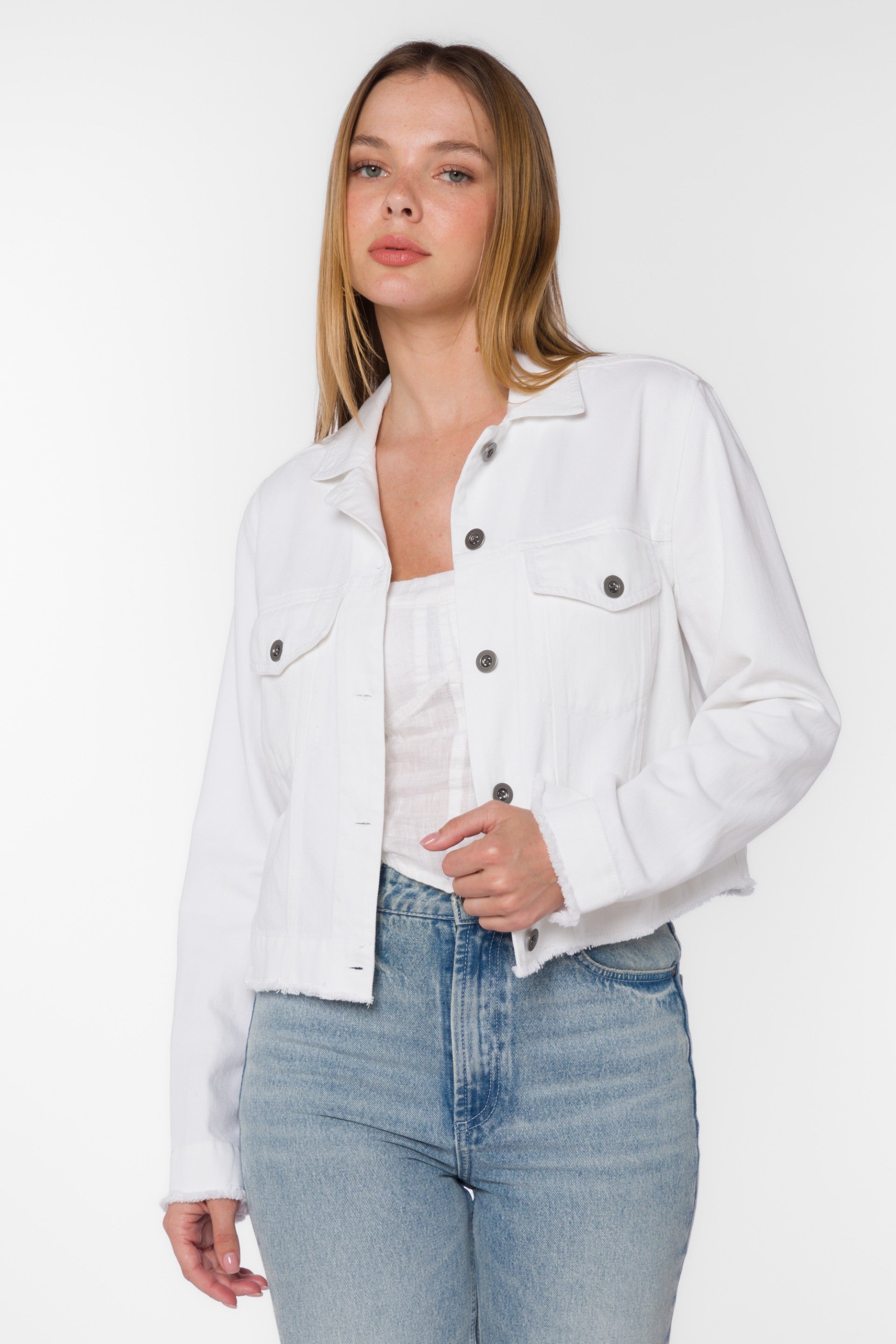 The Larue Optic White Jacket is made from a super soft denim and features a frayed hem.