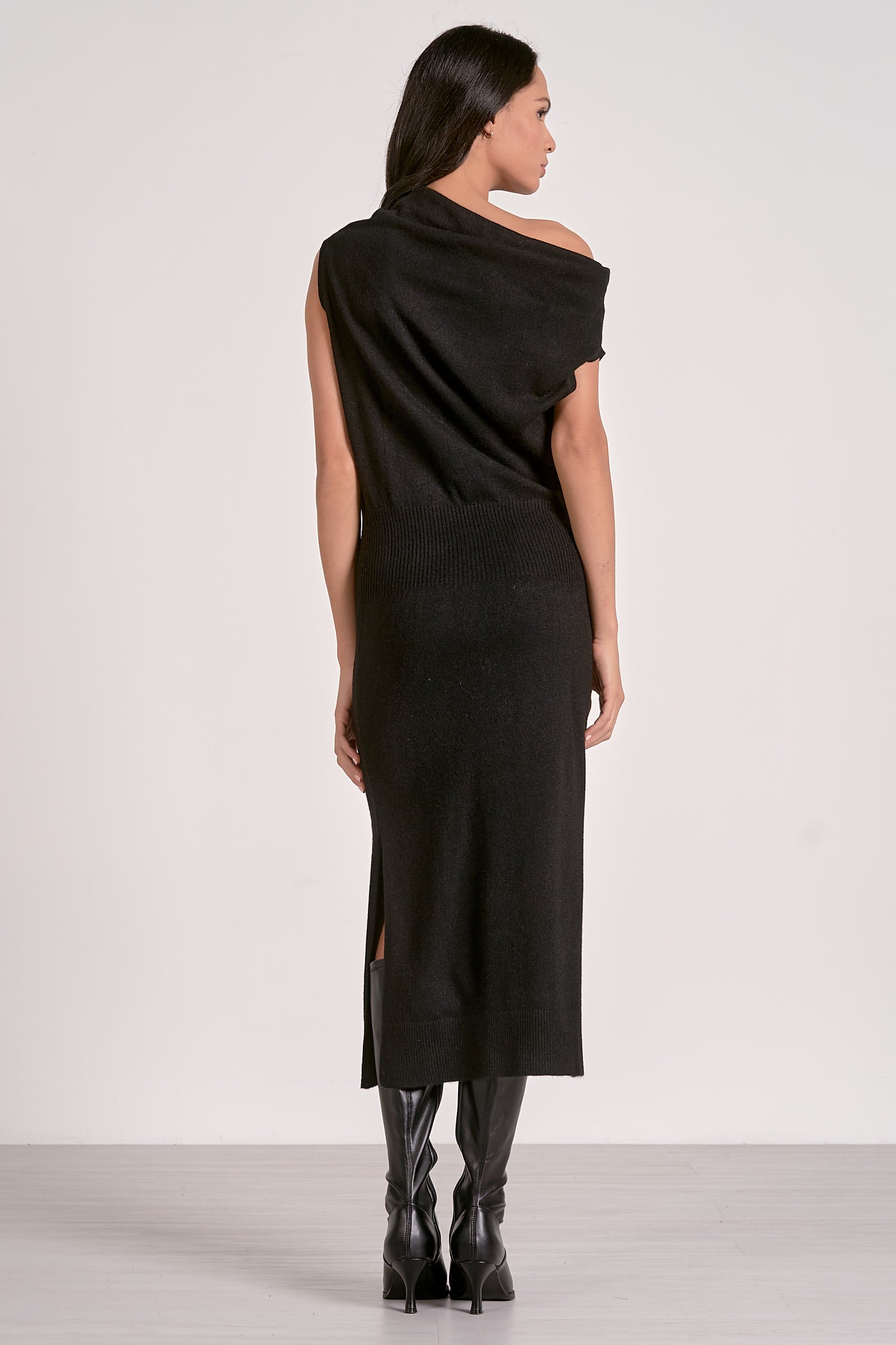 A gorgeous off the shoulder dress in the must have plum color. A side slit and waist detail. Wear with boots or heels.
