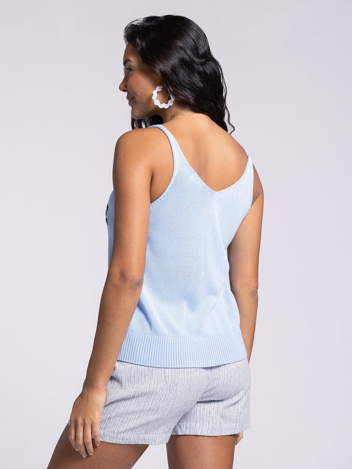 A lightweight sleeveless sweater in a gorgeous light blue. Lake Life is so cute!