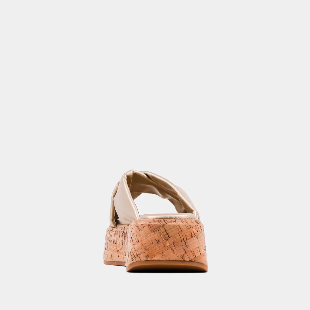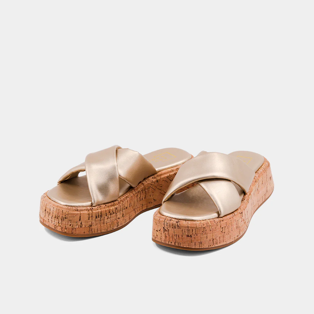 Step into a touch of glam with the LYDIA in gold. The soft metallic faux leather straps add just the right amount of shine, while the cork platform sole brings a relaxed yet stylish vibe. Whether you're dressing up or keeping it casual, these sandals will turn heads.