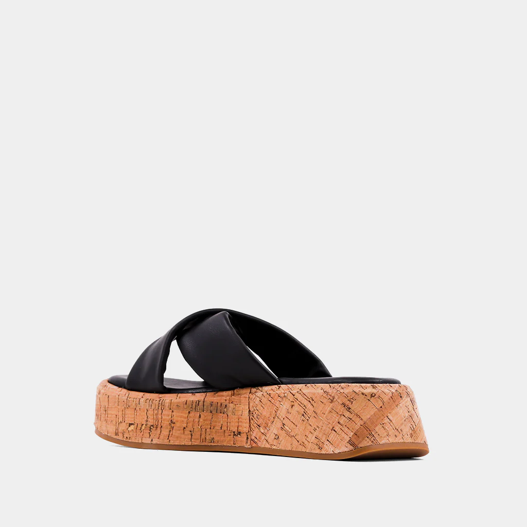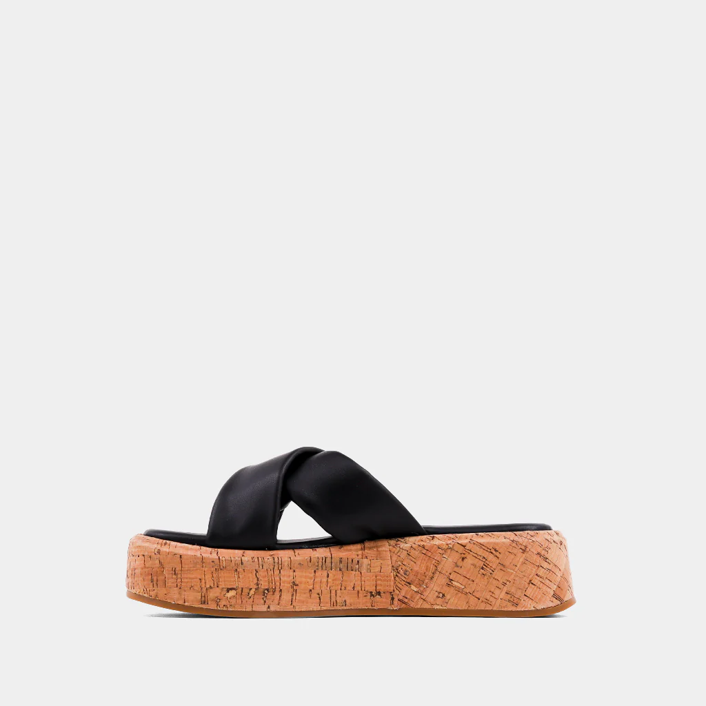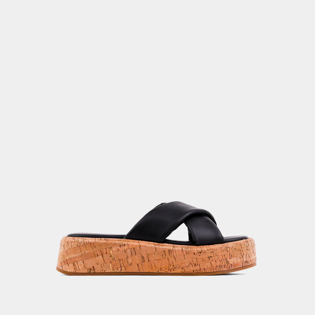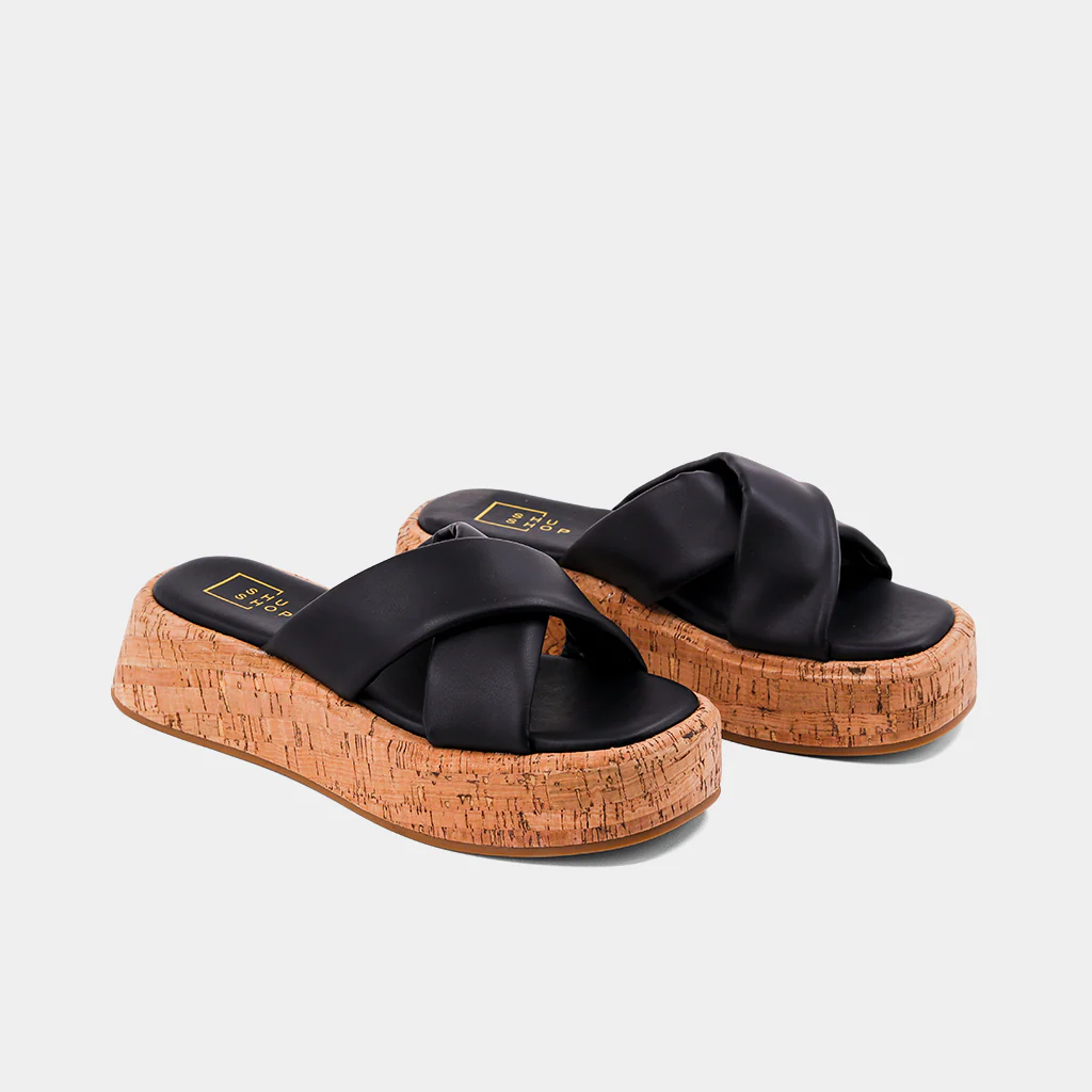 Chic and versatile, the LYDIA in black faux leather is a must-have for effortless style. The sleek crisscross straps and cork platform sole create the perfect balance of edgy and laid-back. Pair them with anything from wide-leg pants to flowy dresses for an elevated casual look.