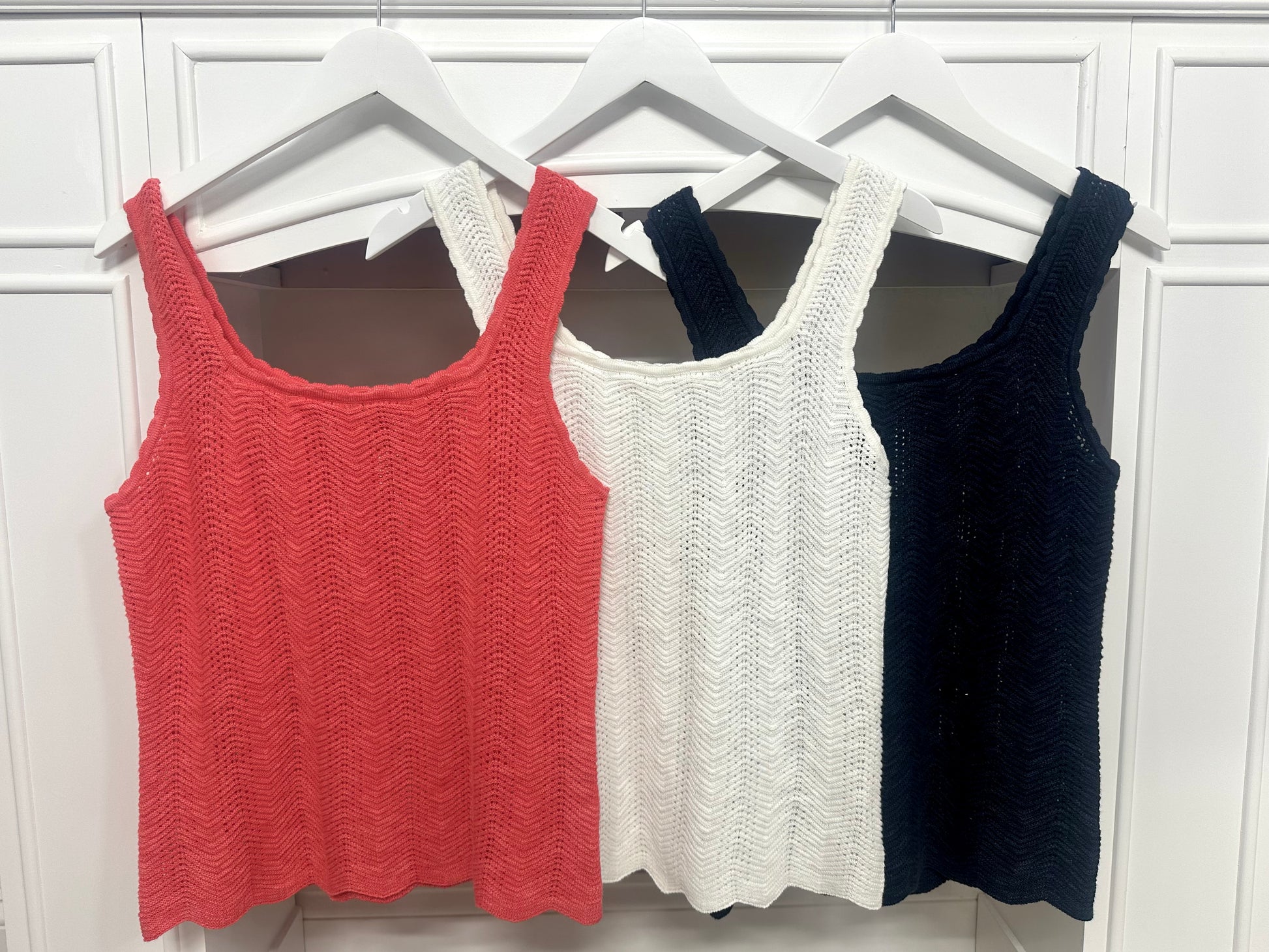 A sleeveless pointelle knit tank that comes in 3 colors. This is easy to wear, layers beautifully and is lovely on its own.