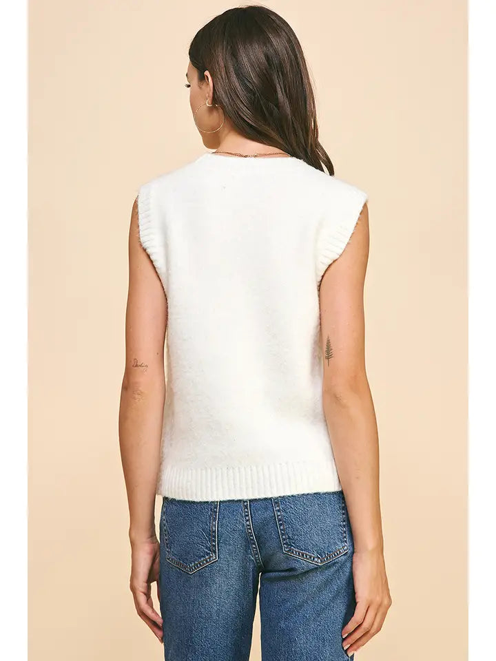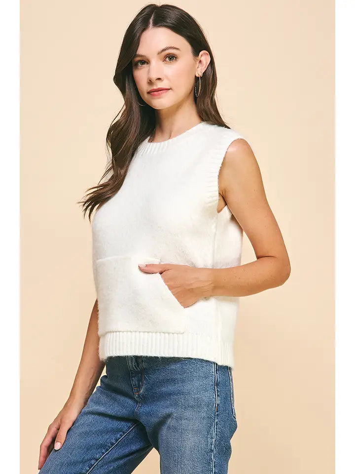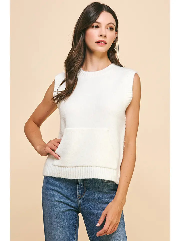 An adorable sleeveless sweater that is cute with shorts, skirts, jeans. And super cute as a layering piece, either with something under, or itself under a jacket or flannel shirt. We love the cream color and kangaroo pocket. Round neck.