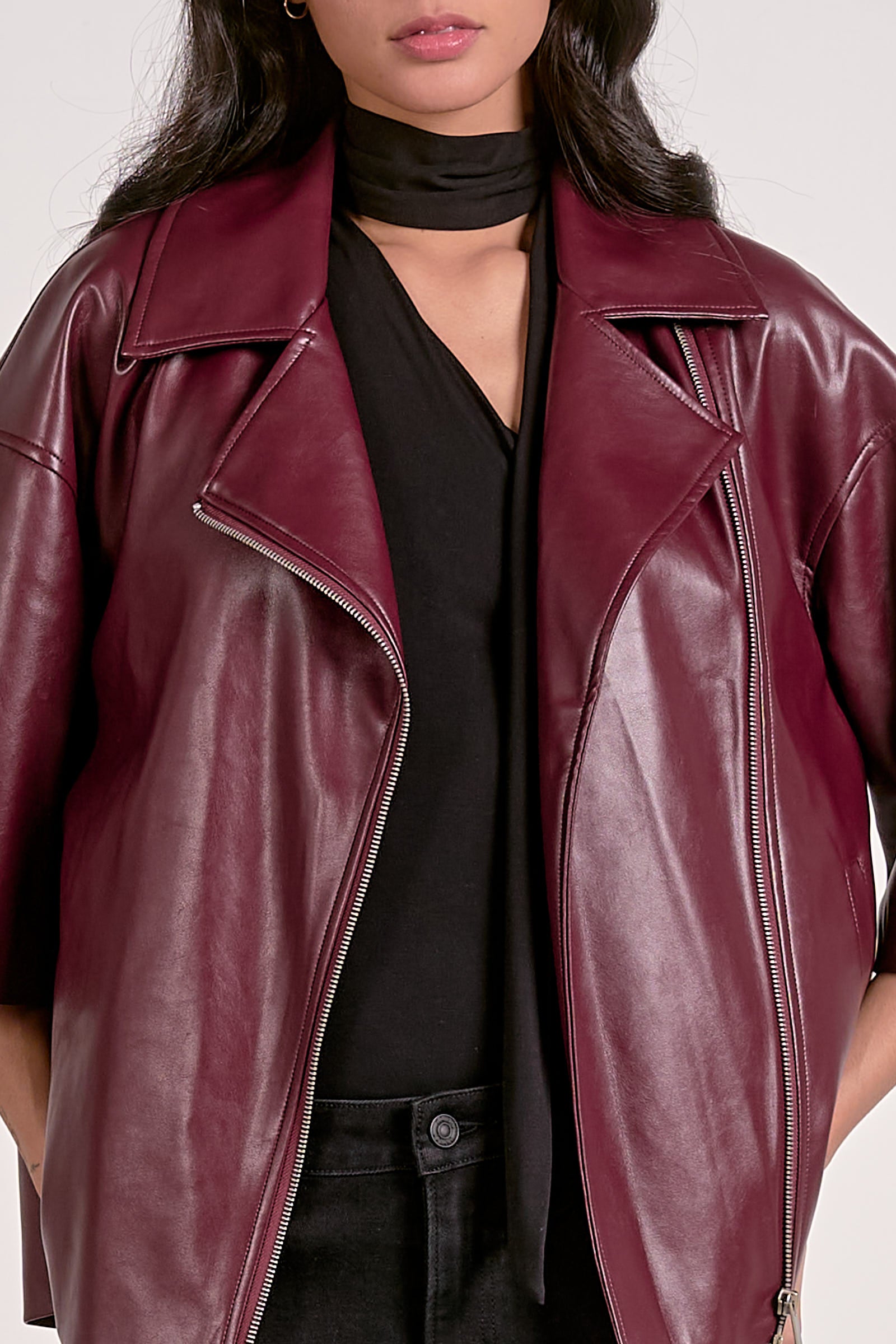 This will stop you right in your tracks. The color, the style, all of it. Simply stunning. A 3/4 sleeve and open cuff with a moto type front zip. An open and longer style waist will give you lots of coverage and leave you to choose to wear it as a jacket, a blazer, or a top. The plum color is one of our favorites this season.