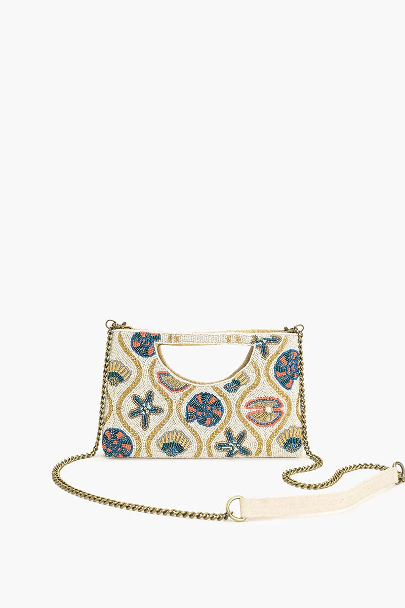 This beautifully designed cutout handle clutch is a true standout, featuring all-over shells and starfish intricately embellished on a soft off-white bead background.