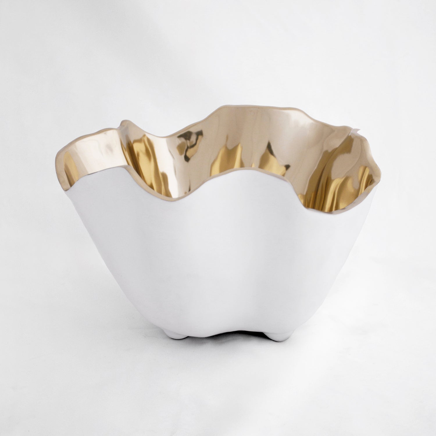 Our THANNI Ice Bucket (White and Gold) is a design with a difference. The striking sculptural form is a perfect match for the lifestyle demands of today. Presented in surfaces of gold-tone metal and white enamel, the artisan-crafted piece features sloping, undulating sides in white that open up to reveal the golden metal inside. Artfully designed with feet that gently elevate the sensuous design, it is the very essence of beauty and versatility. The THANNI Ice Bucket (White and Gold) is ideal for serving ice or chilling wine. Makes a sensational centerpiece. The stunning luxe THANNI Collection pieces are drop dead gorgeous! Sculptural shapes designed by Beatriz to add “wow” to any tabletop and combining color surfaces with brilliant gold or silver tones. The pieces are simply spectacular and are as beautiful as they are practical! You will not believe that the finishes are so sturdy that they can go even in commercial dishwashers!