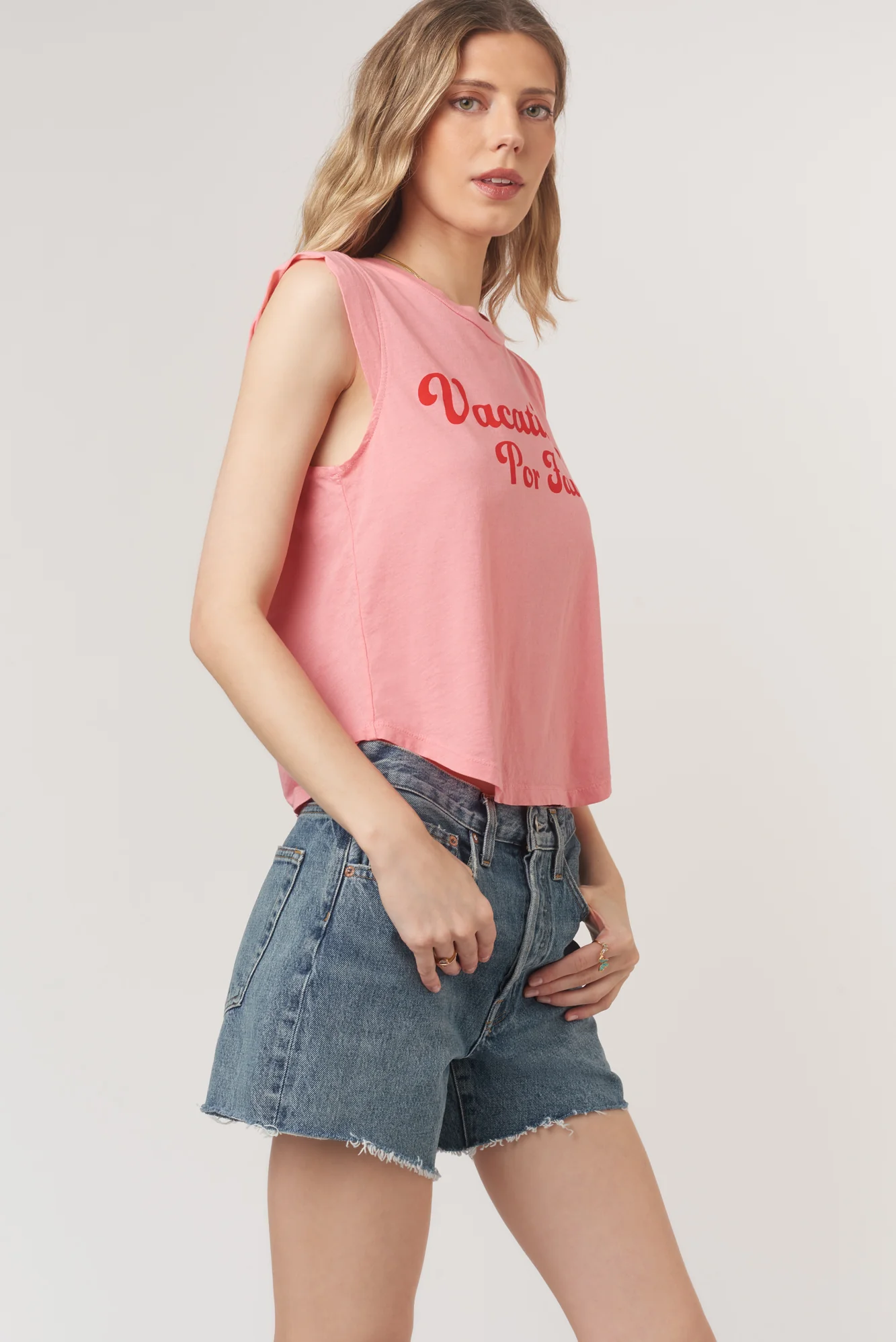 The Vacation Por Favor Tank features a muscle tank silhouette that's gently relaxed and true to size, with a crew neckline and soft 100% cotton fabric. The fun pink backdrop and bold red text make this the perfect top to channel your vacation vibes, wherever you are.